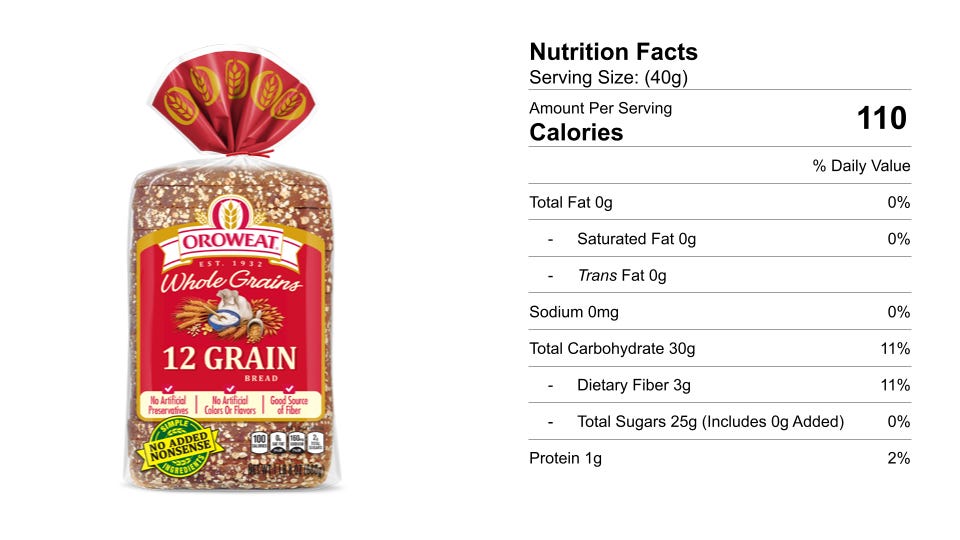 The packaging boasts “Good Source of Fiber.” Fiber is good for our digestive health, but it also lowers risks for diabetes, heart disease, and stroke. How many grams of dietary fiber are in the loaf?