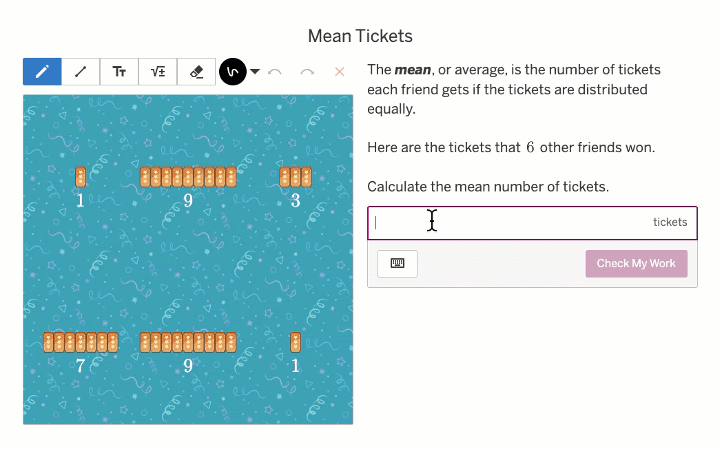We’re not just telling students what the mean is. Yes, we define it clearly: “The mean, or average, is the number of tickets each friend gets if the tickets are distributed equally.”