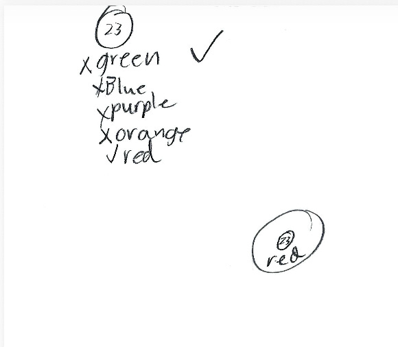 When I asked her what number 21 would look like (and then 35, and then 23), you can see her listing out the colors and going through each color, naming the multiples out loud, then putting an ✗ if it’s not possible and a ✓ if it is.