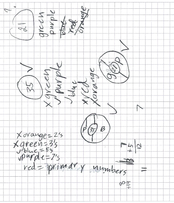 She recorded her thinking! “orange = 2’s,” “green = 3’s,” etc. And of course, labeled the red as “primary numbers.”