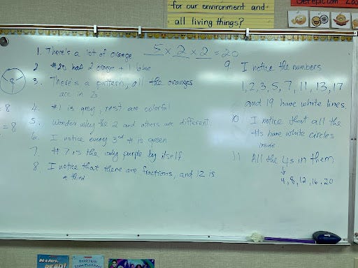 But last week I got to repeat this lesson with a spirited and thoughtful 3rd grader who makes me miss being in the classroom terribly. I showed her the chart above. Same ask: tell me what you see.