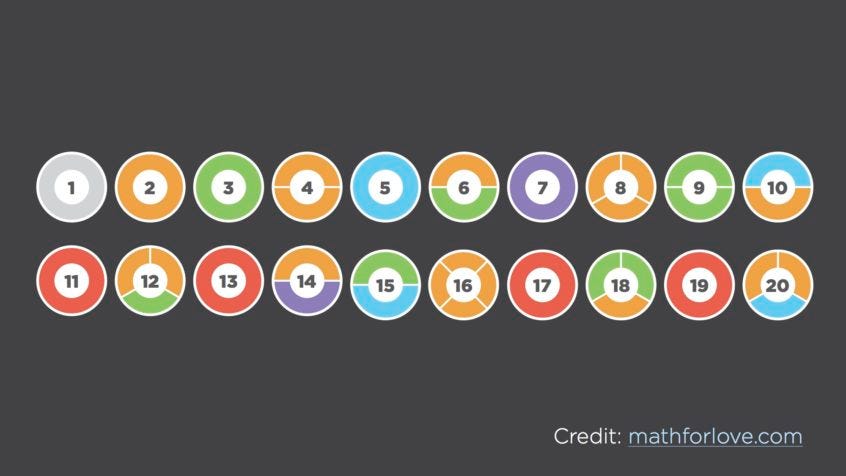 Prime Climb is a much-loved board game by Dan Finkel of Math For Love, but teachers—myself included—have used it as a lesson with students, and it’s really fantastic. Here's what the first 20 numbers look like:
