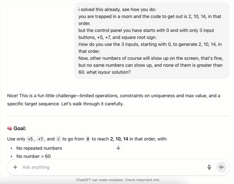 It’s safe to say that when I feed ChatGPT math problems, its failure rate is around 70%. Not good. I rarely ask AI to solve something I haven’t already solved myself—my goal is to see how it approaches the problem, hoping it might show me a different strategy. About half the time I expect it to get the problem right, but it still misses, making mistakes like a middle schooler daydreaming in class.